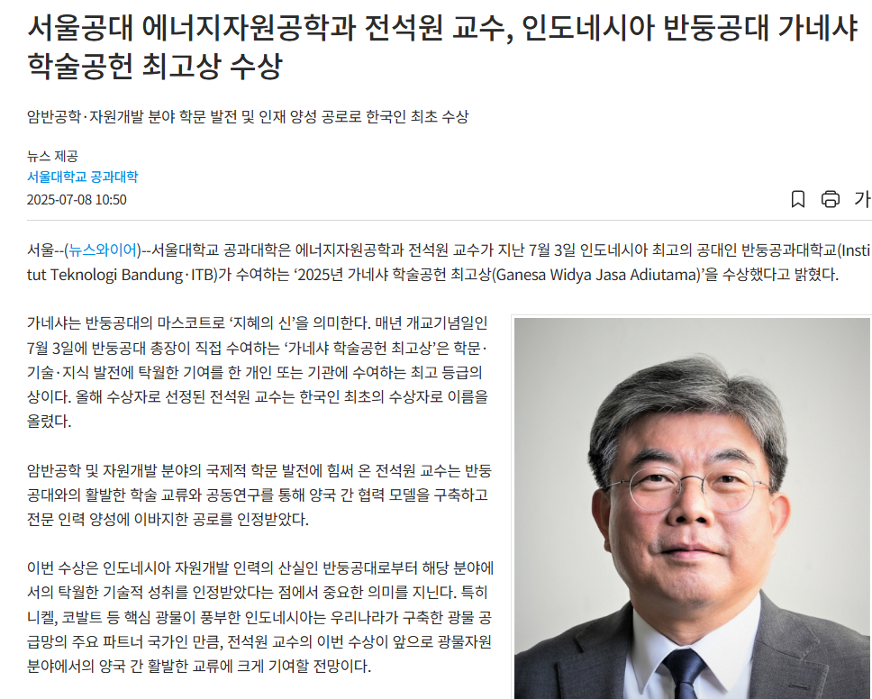 서울공대 에너지 자원공학과 전석원 교수님이 인도네시아 최고의 공대인 반둥공과대학교(Institut Teknologi Bandung·ITB)가 수여하는 ‘2025년 가네샤 학술공헌 최고상(Ganesa Widya Jasa Adiutama)’을 한국인 최초로 수상하였다. (관련 기사)