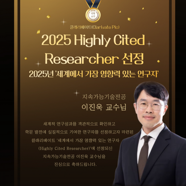 세계적 연구성과를 객관적으로 확인하고 학문 발전에 실질적으로 기여한 연구자를 선정하기 위해 마련된 클래리베이트의 ‘세계에서 가장 영향력 있는 연구자(Highly Cited Researcher)’에 에너지자원 공학과 이진욱 교수가 선정되었다.